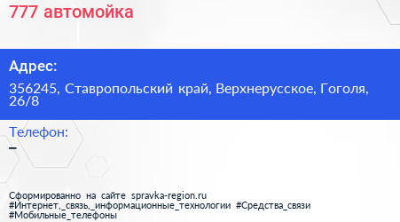 777, автомойка по адресу 356245, Ставропольский край, Верхнерусское, Гоголя, 26/8 в дальнейшем Организация, размещена в следующих категориях: