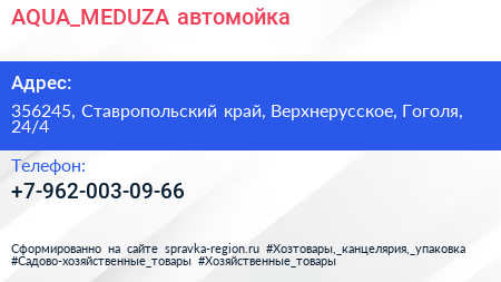 AQUA_MEDUZA, автомойка по адресу 356245, Ставропольский край, Верхнерусское, Гоголя, 24/4 в дальнейшем Организация, размещена в следующих категориях:
