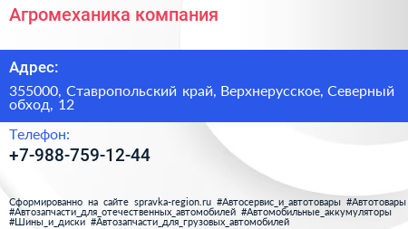 Агромеханика, компания по адресу 355000, Ставропольский край, Верхнерусское, Северный обход, 12 в дальнейшем Организация, размещена в следующих категориях: