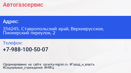 Автогазсервис по адресу 356245, Ставропольский край, Верхнерусское, Пионерский переулок, 2 в дальнейшем Организация, размещена в следующих категориях: