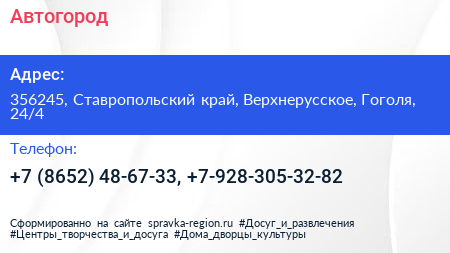 Автогород по адресу 356245, Ставропольский край, Верхнерусское, Гоголя, 24/4 в дальнейшем Организация, размещена в следующих категориях: