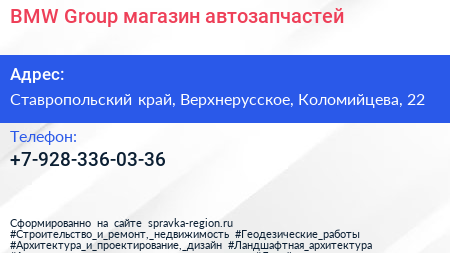 BMW Group, магазин автозапчастей по адресу Ставропольский край, Верхнерусское, Коломийцева, 22 в дальнейшем Организация, размещена в следующих категориях: