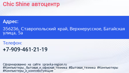 Chic & Shine, автоцентр по адресу 356236, Ставропольский край, Верхнерусское, Батайская улица, 5а в дальнейшем Организация, размещена в следующих категориях: