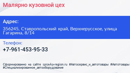 Малярно-кузовной цех по адресу 356245, Ставропольский край, Верхнерусское, улица Гагарина, 8/14 в дальнейшем Организация, размещена в следующих категориях: