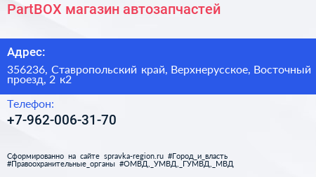 PartBOX, магазин автозапчастей по адресу 356236, Ставропольский край, Верхнерусское, Восточный проезд, 2 к2 в дальнейшем Организация, размещена в следующих категориях:
