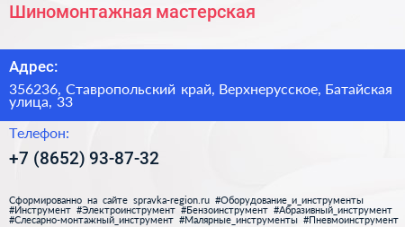 Шиномонтажная мастерская по адресу 356236, Ставропольский край, Верхнерусское, Батайская улица, 33 в дальнейшем Организация, размещена в следующих категориях: