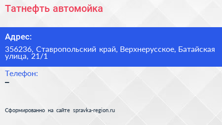 Татнефть, автомойка по адресу 356236, Ставропольский край, Верхнерусское, Батайская улица, 21/1 в дальнейшем Организация, размещена в следующих категориях: