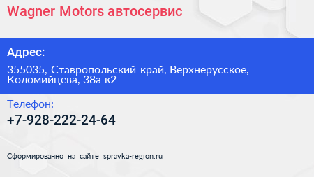 Wagner Motors, автосервис по адресу 355035, Ставропольский край, Верхнерусское, Коломийцева, 38а к2 в дальнейшем Организация, размещена в следующих категориях: