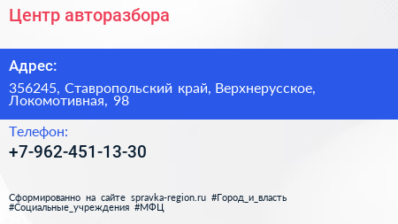 Центр авторазбора по адресу 356245, Ставропольский край, Верхнерусское, Локомотивная, 98 в дальнейшем Организация, размещена в следующих категориях: