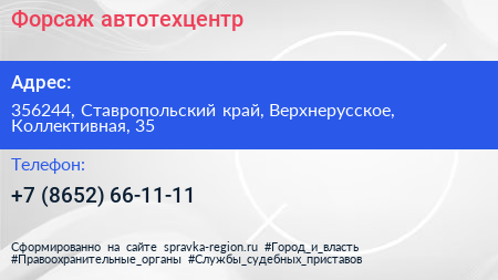 Форсаж, автотехцентр по адресу 356244, Ставропольский край, Верхнерусское, Коллективная, 35 в дальнейшем Организация, размещена в следующих категориях: