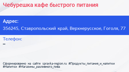 Чебурешка, кафе быстрого питания по адресу 356245, Ставропольский край, Верхнерусское, Гоголя, 77 в дальнейшем Организация, размещена в следующих категориях: