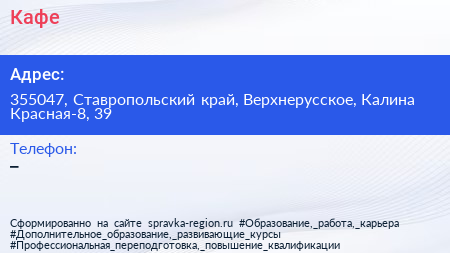 Кафе по адресу 355047, Ставропольский край, Верхнерусское, Калина Красная-8, 39 в дальнейшем Организация, размещена в следующих категориях: