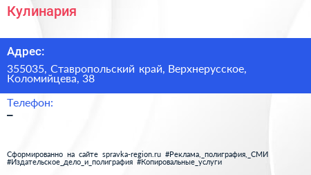 Кулинария по адресу 355035, Ставропольский край, Верхнерусское, Коломийцева, 38 в дальнейшем Организация, размещена в следующих категориях: