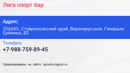 Лига, спорт-бар по адресу 356245, Ставропольский край, Верхнерусское, Генерала Ерёмина, 82 в дальнейшем Организация, размещена в следующих категориях: