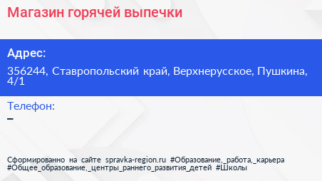 Магазин горячей выпечки по адресу 356244, Ставропольский край, Верхнерусское, Пушкина, 4/1 в дальнейшем Организация, размещена в следующих категориях: