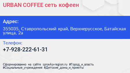 URBAN COFFEE, сеть кофеен по адресу 355035, Ставропольский край, Верхнерусское, Батайская улица, 2а в дальнейшем Организация, размещена в следующих категориях: