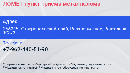 ЛОМЕТ, пункт приема металлолома по адресу 356245, Ставропольский край, Верхнерусское, Вокзальная, 103/3 в дальнейшем Организация, размещена в следующих категориях: