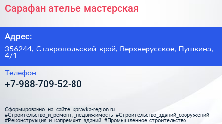 Сарафан, ателье-мастерская по адресу 356244, Ставропольский край, Верхнерусское, Пушкина, 4/1 в дальнейшем Организация, размещена в следующих категориях: