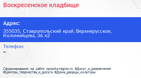Воскресенское кладбище по адресу 355035, Ставропольский край, Верхнерусское, Коломийцева, 36 к2 в дальнейшем Организация, размещена в следующих категориях: