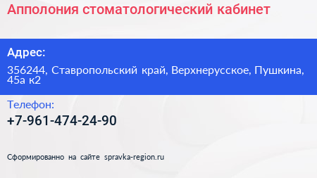 Апполония, стоматологический кабинет по адресу 356244, Ставропольский край, Верхнерусское, Пушкина, 45а к2 в дальнейшем Организация, размещена в следующих категориях: