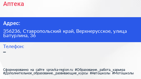 Аптека по адресу 356236, Ставропольский край, Верхнерусское, улица Батурлина, 36 в дальнейшем Организация, размещена в следующих категориях: