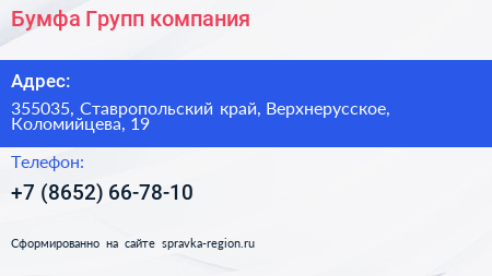 Бумфа Групп, компания по адресу 355035, Ставропольский край, Верхнерусское, Коломийцева, 19 в дальнейшем Организация, размещена в следующих категориях: