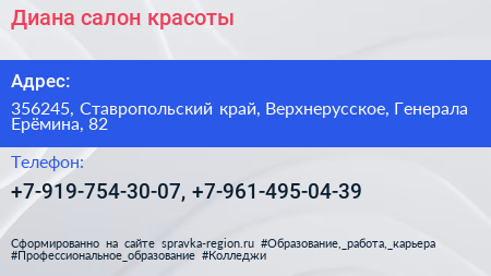 Диана, салон красоты по адресу 356245, Ставропольский край, Верхнерусское, Генерала Ерёмина, 82 в дальнейшем Организация, размещена в следующих категориях: