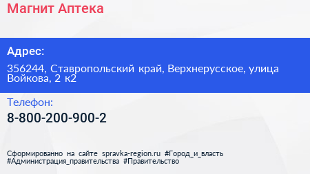 Магнит-Аптека по адресу 356244, Ставропольский край, Верхнерусское, улица Войкова, 2 к2 в дальнейшем Организация, размещена в следующих категориях: