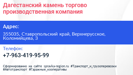 Дагестанский камень, торгово-производственная компания по адресу 355035, Ставропольский край, Верхнерусское, Коломийцева, 3 в дальнейшем Организация, размещена в следующих категориях: