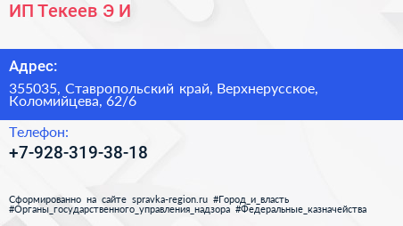 ИП Текеев Э.И. по адресу 355035, Ставропольский край, Верхнерусское, Коломийцева, 62/6 в дальнейшем Организация, размещена в следующих категориях: