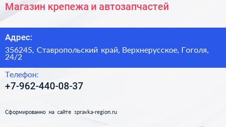 Магазин крепежа и автозапчастей по адресу 356245, Ставропольский край, Верхнерусское, Гоголя, 24/2 в дальнейшем Организация, размещена в следующих категориях: