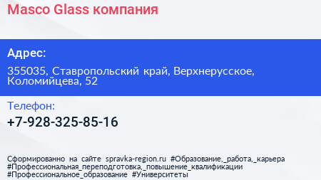 Masco Glass, компания по адресу 355035, Ставропольский край, Верхнерусское, Коломийцева, 52 в дальнейшем Организация, размещена в следующих категориях: