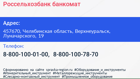 Россельхозбанк, банкомат по адресу 457670, Челябинская область, Верхнеуральск, Луначарского, 19 в дальнейшем Организация, размещена в следующих категориях: