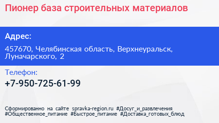 Пионер, база строительных материалов по адресу 457670, Челябинская область, Верхнеуральск, Луначарского, 2 в дальнейшем Организация, размещена в следующих категориях:
