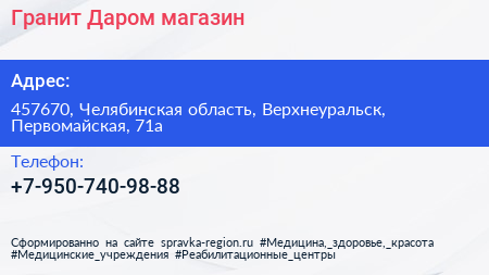 Гранит Даром, магазин по адресу 457670, Челябинская область, Верхнеуральск, Первомайская, 71а в дальнейшем Организация, размещена в следующих категориях: