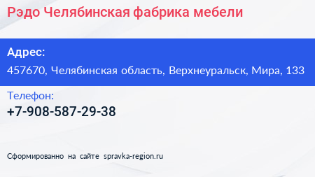 Рэдо, Челябинская фабрика мебели по адресу 457670, Челябинская область, Верхнеуральск, Мира, 133 в дальнейшем Организация, размещена в следующих категориях: