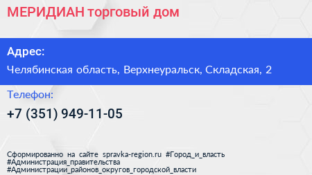 МЕРИДИАН, торговый дом по адресу Челябинская область, Верхнеуральск, Складская, 2 в дальнейшем Организация, размещена в следующих категориях:
