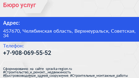 Бюро услуг по адресу 457670, Челябинская область, Верхнеуральск, Советская, 34 в дальнейшем Организация, размещена в следующих категориях: