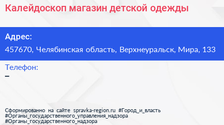 Калейдоскоп, магазин детской одежды по адресу 457670, Челябинская область, Верхнеуральск, Мира, 133 в дальнейшем Организация, размещена в следующих категориях: