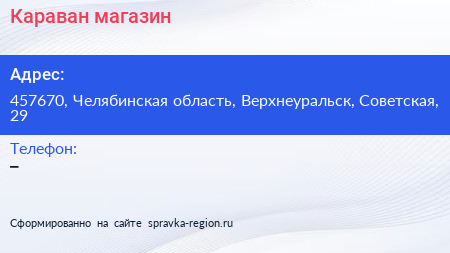 Караван, магазин по адресу 457670, Челябинская область, Верхнеуральск, Советская, 29 в дальнейшем Организация, размещена в следующих категориях: