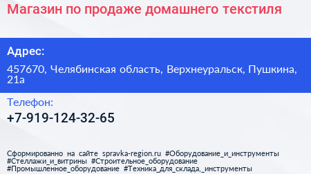 Магазин по продаже домашнего текстиля по адресу 457670, Челябинская область, Верхнеуральск, Пушкина, 21а в дальнейшем Организация, размещена в следующих категориях: