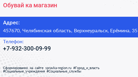 Обувай-ка, магазин по адресу 457670, Челябинская область, Верхнеуральск, Ерёмина, 35 в дальнейшем Организация, размещена в следующих категориях: