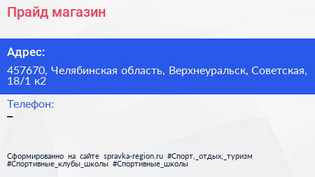 Прайд, магазин по адресу 457670, Челябинская область, Верхнеуральск, Советская, 18/1 к2 в дальнейшем Организация, размещена в следующих категориях: