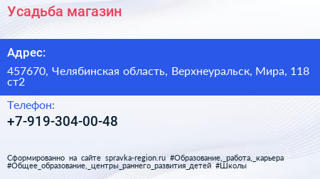 Усадьба, магазин по адресу 457670, Челябинская область, Верхнеуральск, Мира, 118 ст2 в дальнейшем Организация, размещена в следующих категориях: