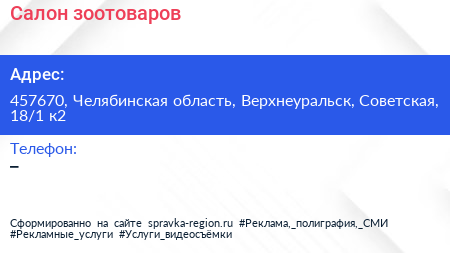 Салон зоотоваров по адресу 457670, Челябинская область, Верхнеуральск, Советская, 18/1 к2 в дальнейшем Организация, размещена в следующих категориях: