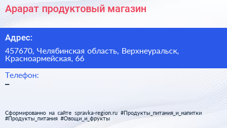 Арарат, продуктовый магазин по адресу 457670, Челябинская область, Верхнеуральск, Красноармейская, 66 в дальнейшем Организация, размещена в следующих категориях: