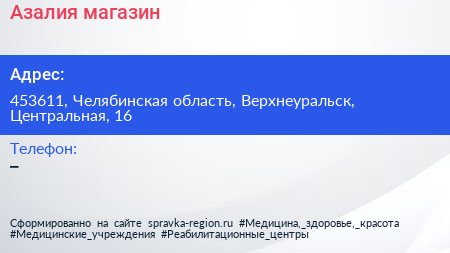 Азалия, магазин по адресу 453611, Челябинская область, Верхнеуральск, Центральная, 16 в дальнейшем Организация, размещена в следующих категориях:
