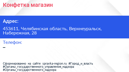 Конфетка, магазин по адресу 453611, Челябинская область, Верхнеуральск, Набережная, 28 в дальнейшем Организация, размещена в следующих категориях:
