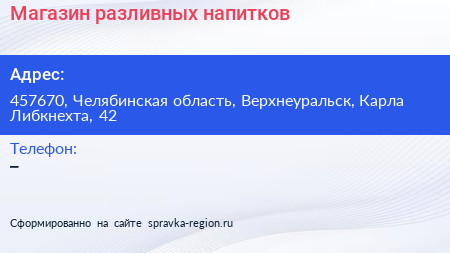 Магазин разливных напитков по адресу 457670, Челябинская область, Верхнеуральск, Карла Либкнехта, 42 в дальнейшем Организация, размещена в следующих категориях: