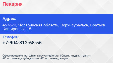Пекарня по адресу 457670, Челябинская область, Верхнеуральск, Братьев Кашириных, 18 в дальнейшем Организация, размещена в следующих категориях: